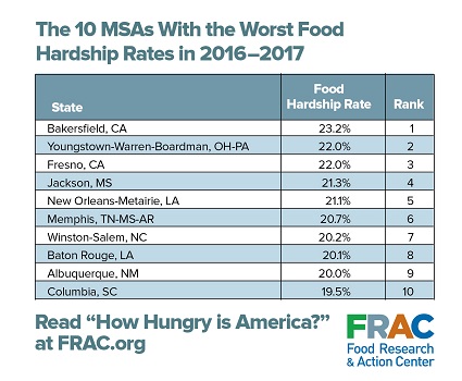 How Hungry is America? contains data for the nation for 2017 and for every state and the District of Columbia, and 108 metropolitan statistical areas (MSA) for 2016–2017. The data were gathered as part of the Gallup-Sharecare Well-Being Index project, which has been interviewing hundreds of households daily since January 2008. FRAC analyzed responses to the question: “Have there been times in the past twelve months when you did not have enough money to buy food that you or your family needed?” A “yes” answer to this question is considered to signal that the household experienced food hardship. FRAC uses the phrase “food hardship” to avoid confusion with the annual Census Bureau/U.S. Department of Agriculture survey and analysis that produces “food insecurity” numbers, but the concepts are comparable.
