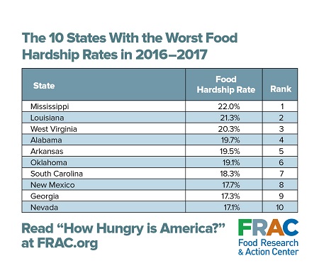 WASHINGTON, August 1, 2018 — In every part of the nation, a large number of households is experiencing food hardship — the inability to afford enough food for themselves and their families — according to a new report by the Food Research & Action Center. “How Hungry is America?” reveals that, after several years of decline, the national food hardship rate for all households increased from 15.1 percent in 2016 to 15.7 percent in 2017.