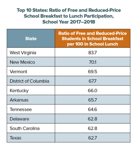 The Scorecard ranks states and the District of Columbia on the basis of the rate of participation of low-income children in the School Breakfast Program compared to the rate of participation of low-income children in the National School Lunch Program. West Virginia topped the list, with New Mexico and Vermont coming in second and third, respectively. West Virginia and New Mexico also exceeded FRAC’s goal for states to reach 70 low-income children with school breakfast for every 100 who ate school lunch. FRAC’s interactive school breakfast map shows state-by-state participation data.