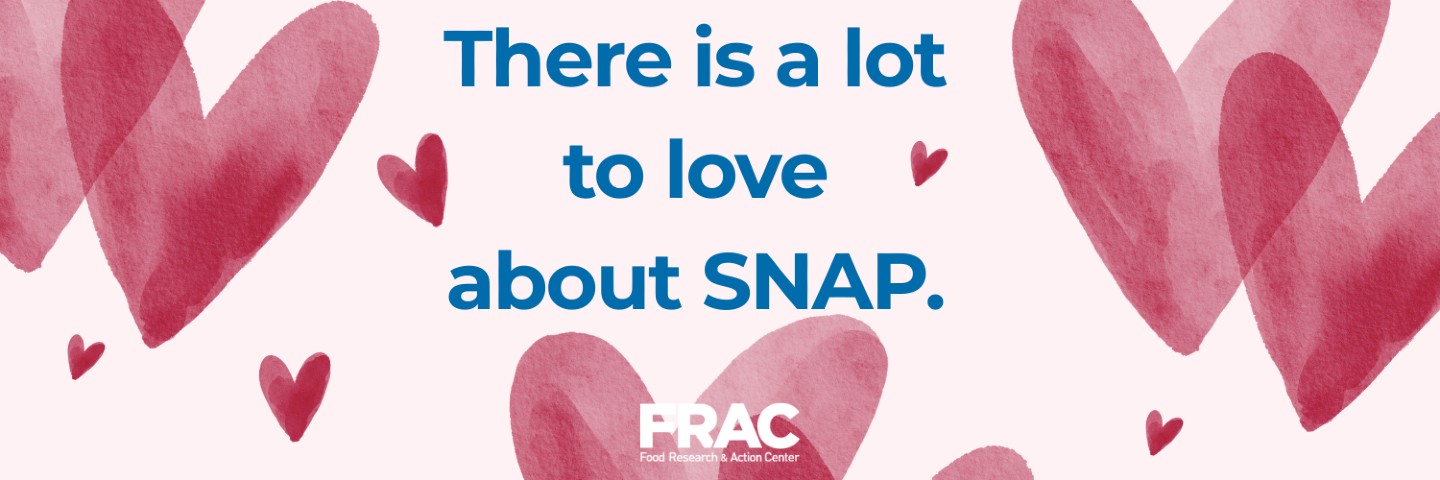 Take part in FRAC’s #WhyILoveSNAP campaign throughout February to lift up why SNAP matters to millions of people — including children, older adults, veterans, and people with disabilities — and urge Congress to repeal the harmful SNAP cuts in the budget reconciliation law (H.R. 1). And be sure to mark your calendar for a dedicated week of action (Feb. 9–13) leading up to Valentine’s Day.