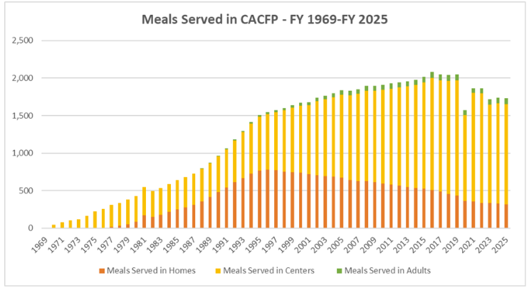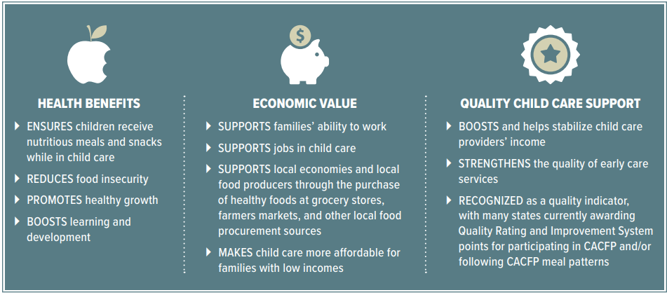 For decades, the Child and Adult Care Food Program (CACFP) has acted as a nutrition lifeline across the country, providing funding to support meals served at child care centers, family child care homes, afterschool programs, Head Start classrooms, emergency shelters, and adult day care centers across the country. By subsidizing the cost of nutritious meals and snacks at these locations, CACFP plays an important role in improving the quality of child care programs and in making them more affordable for parents with low incomes.
