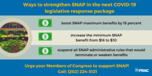 Call, email, or tweet at your Senators during the recess and urge them upon returning to DC, to quickly pass a COVID-19 relief bill that must include a boost to SNAP benefits. This will ensure that individuals and families struggling against hunger can put food on the table and would also stimulate the economy.