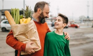 Home > SNAP Cuts Mitigation Hub: Responding to H.R. 1 > H.R. 1 Provision: Increases in Administrative Costs (Sec. 10106) > Father and Son in Grocery Store Parking Lot