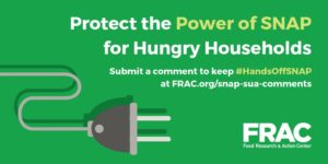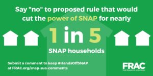 USDA’s proposed rule on SNAP Standardization of State Heating and Cooling Standard Utility Allowances (SUAs) would cut program benefits by a total of $4.5 billion over five years. Use these graphics to spread the word on how this cut would result from changes in how states take households’ utility costs into account in determining the amount of SNAP benefits for which they qualify. Comment here on the proposed rule.