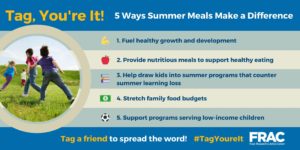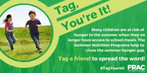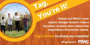 FRAC developed a 2019 Summer Nutrition Report Communications Toolkit for states that includes a national news release and model news release for states. It also has information on participating in FRAC’s Tag, You’re It campaign.